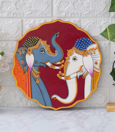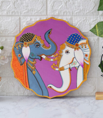 A beautiful pichwai painting of two elephants standing next to each other on a purple plate.